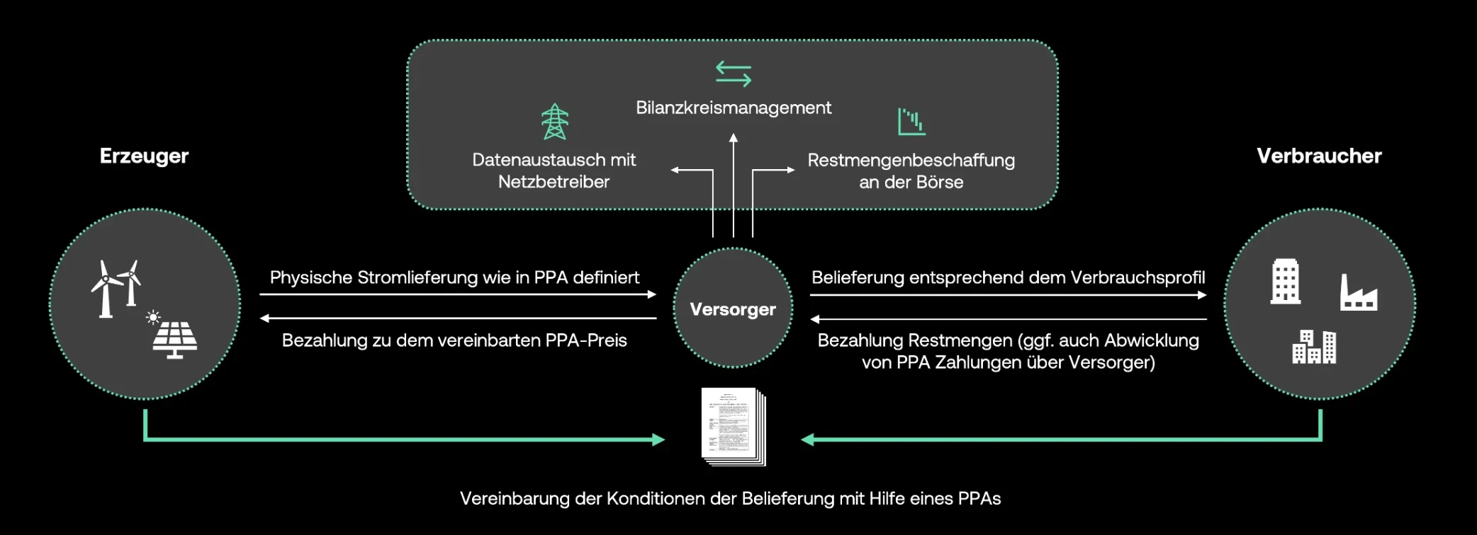Ein PPA kann auf bilateraler Ebene abgeschlossen werden, erfordert aber einen Stromlieferanten in der Mitte zur Abwicklung. Als trawa Kunde erhalten Sie alles aus einer Hand.